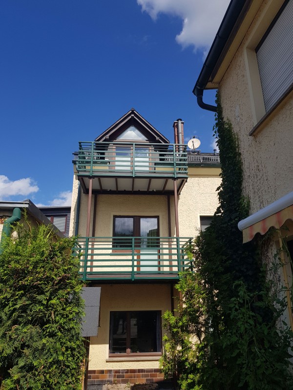 Mehrgeschossiger Balkon in Kombination aus Stahl und Holz