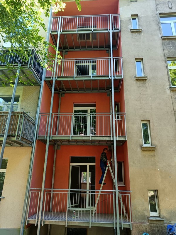 Mehrgeschossiger Balkon in Kombination aus Stahl und Holz